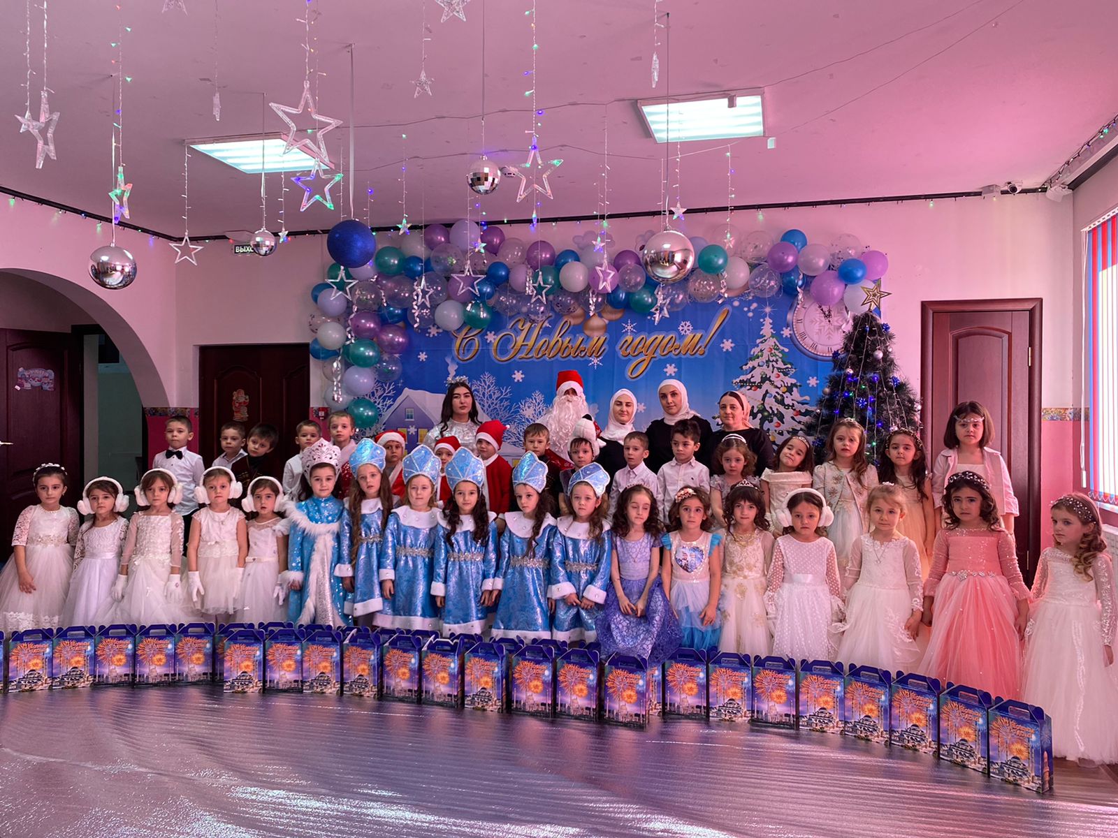 Большое внимание уделили подготовке к утренникам и оформлению актового зала. Воспитатели с детьми разучивали стихотворения, музыкальный руководитель разучивала с воспитанниками песни и танцы, а так же наши воспитатели подготовили для детей очень интересную новогоднюю программу. Им пришлось перевоплотиться в главных героев красивую Снегурочку и конечно же Деда мороза. Сказочные герои увлекли детей в мир сказки и волшебства. Дети окунулись в праздничную атмосферу радости и приключений, с удовольствием участвовали в шуточных конкурсах.